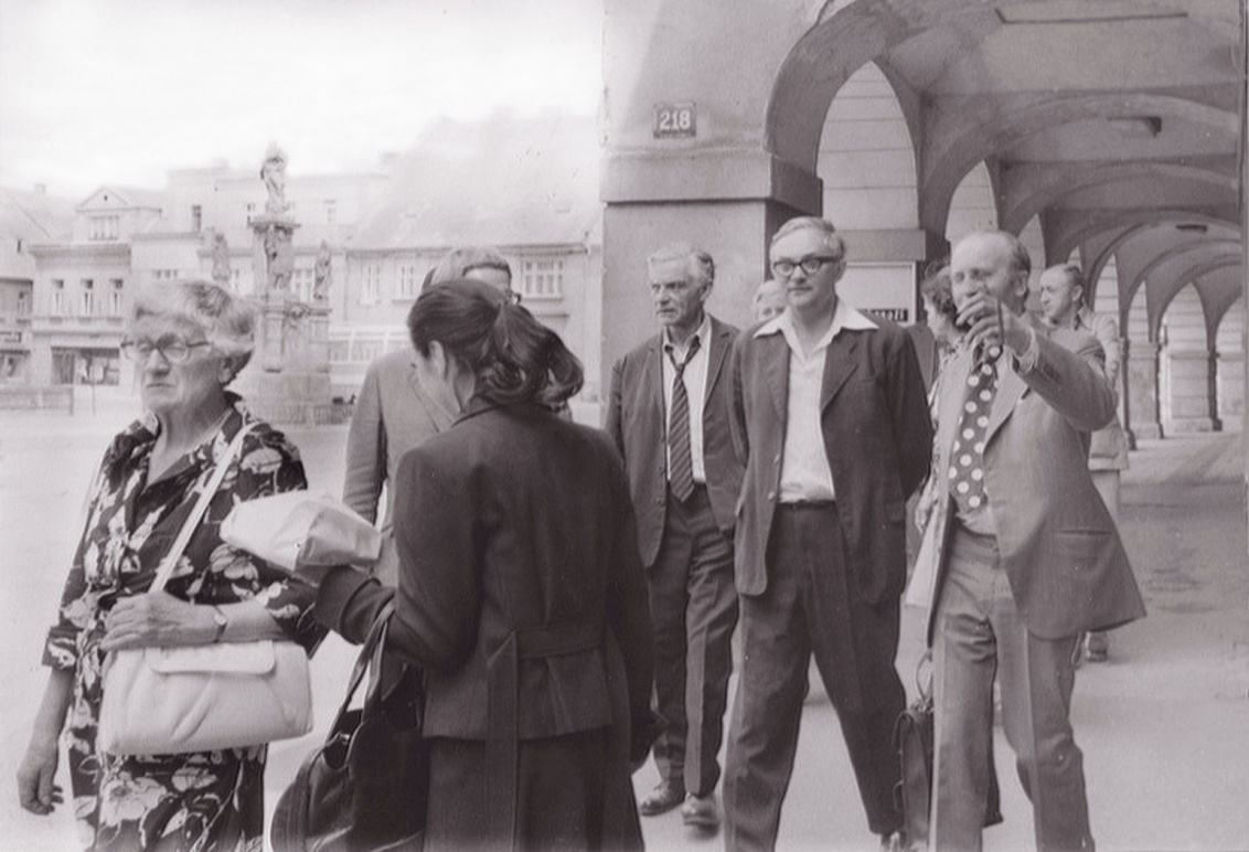 Sobotecké náměstí – asi 1978 – účastníci ukládání urny s ostatky prof. Papouškové