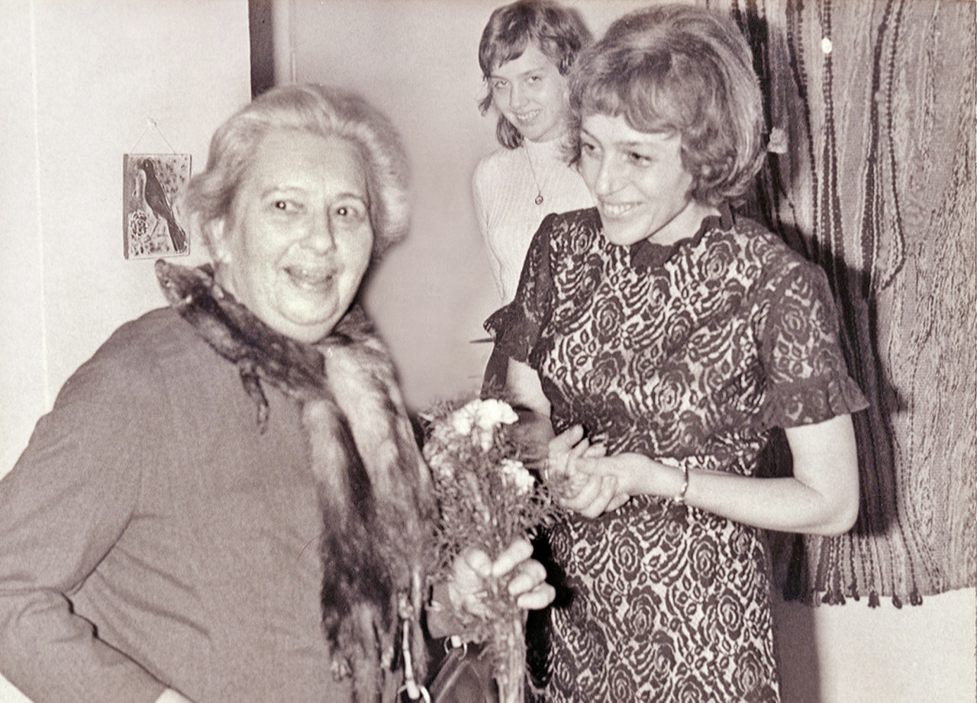 Galerie Letná, r. 1972, vernisáž výstavy Hany BenešovéZleva prof. Papoušková, Hana Benešová a její dcera Sylva Benešová. Dámy Benešovy si dávají vpravo a dolů hleď proto, že jim u nohou dovádí psík Filípek, náležející malířce Aleně Antonové. Toho však fotograf nezachytil.